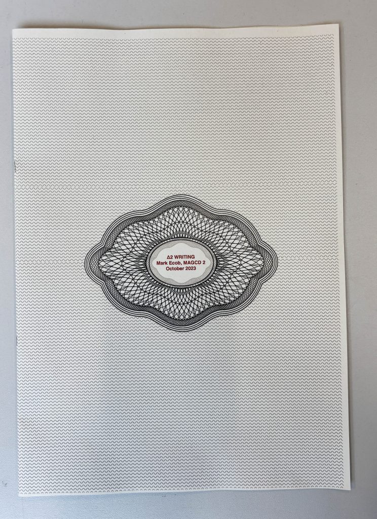 (Showed latest essay printout, laid up into 8pp A4 booklet)