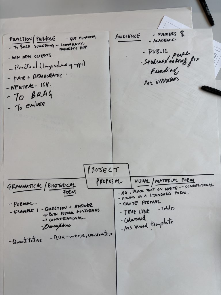 – Group exercise – thewhitepube.co.uk/funding-library – analysed 2 examples of Project Proposals (see image). VERY interesting analysis of a standard form used to get funding, its function, audience, grammatical form and visual/material form. I looked at these in a new way